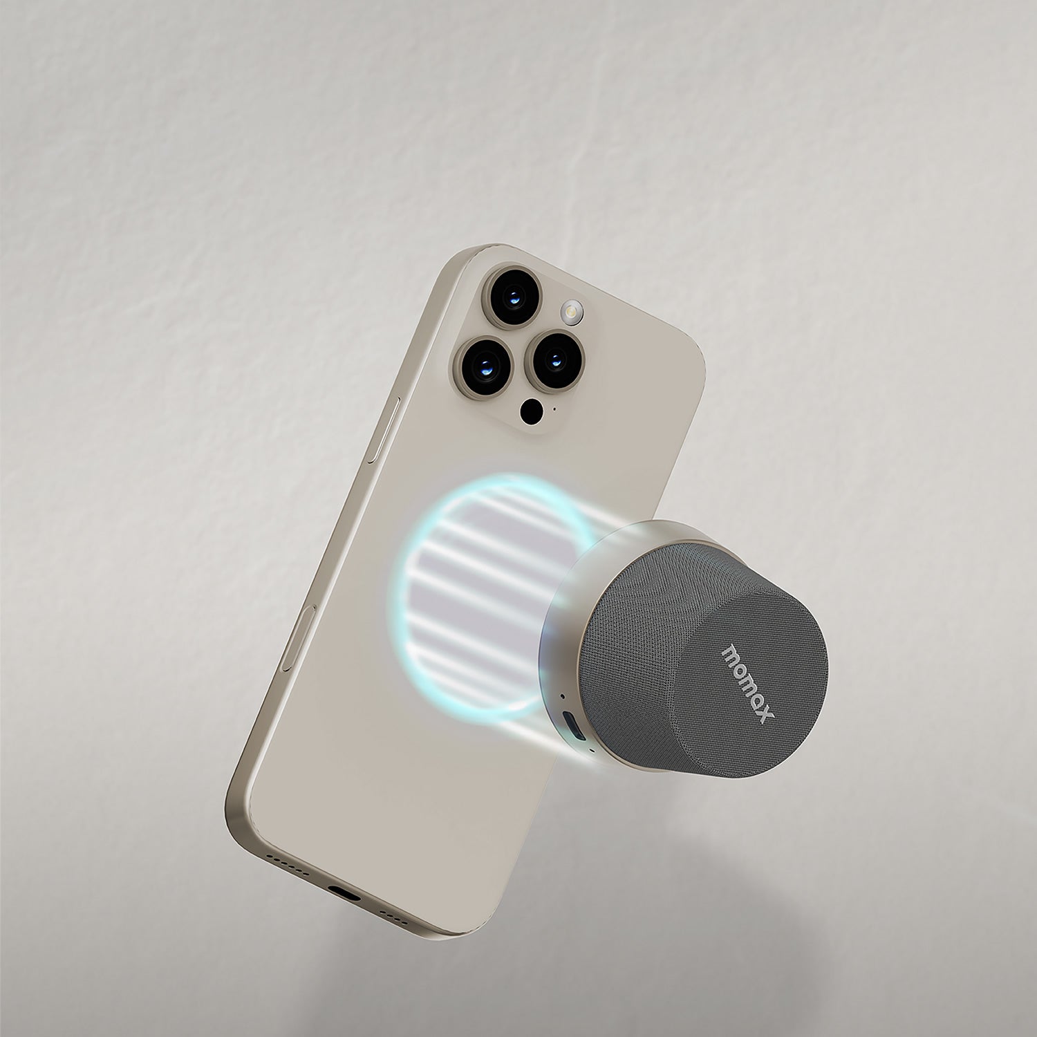 L’enceinte Momax Stereo Pro intègre un aimant puissant qui lui permet de se fixer solidement sur tout support métallique comme un réfrigérateur, un bureau en métal ou un pied de lampe. Elle est également compatible avec les téléphones équipés du système MagSafe (iPhone et certaines coques magnétiques), offrant une fixation stable et pratique.